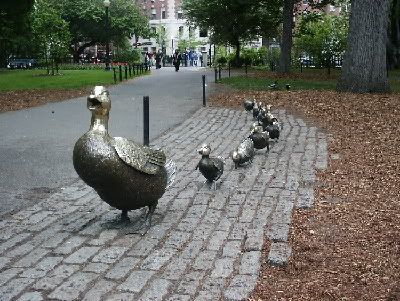 Between the two ends of the Emerson campus is the Boston Commons and the Public Garden. These are two different areas that tourists get confused, though they're probably governed by the same committee. The Commons are really big, while the Garden is about only a third of the size. I've always preferred the Garden, because it's prettier and closer to my dorm, and it has a bridge and a lagoon, and swans, and fountains, and a big statue of George Washington on his horse, and ducklings. Even in the winter, it's like a beautifiul arctic wasteland.